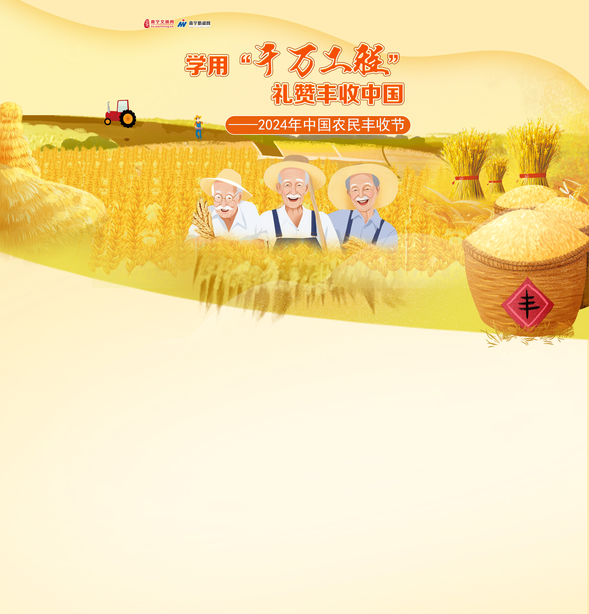 9月21日,2024年南寧市慶祝中國(guó)農(nóng)民豐收節(jié)活動(dòng)正式拉開(kāi)序幕。本次活動(dòng)以“學(xué)用‘千萬(wàn)工程’禮贊豐收中國(guó)”為主題,由南寧市主會(huì)場(chǎng)活動(dòng)啟動(dòng)儀式及12個(gè)縣(市、區(qū))分會(huì)場(chǎng)活動(dòng)組成,全面展示首府“三農(nóng)”工作的成就,充分展現(xiàn)南寧新時(shí)代農(nóng)民精神風(fēng)貌、新農(nóng)村繁榮景象、農(nóng)業(yè)豐收?qǐng)鼍啊?