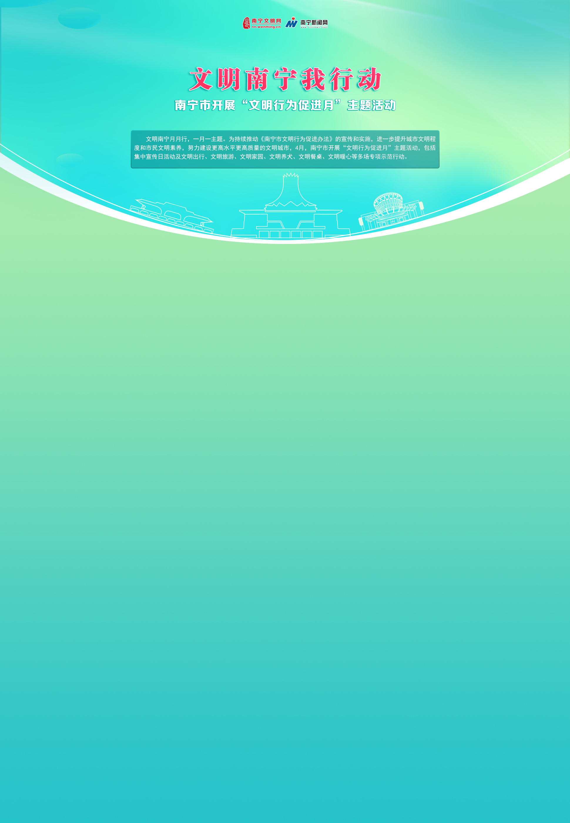 立精神支柱、樹價值標桿、育時代新人,需要每個市民奉獻光和熱,在“南寧市文明行為促進月”,我們倡議:做文明南寧人,我行動。