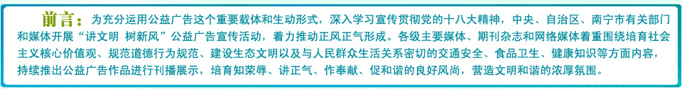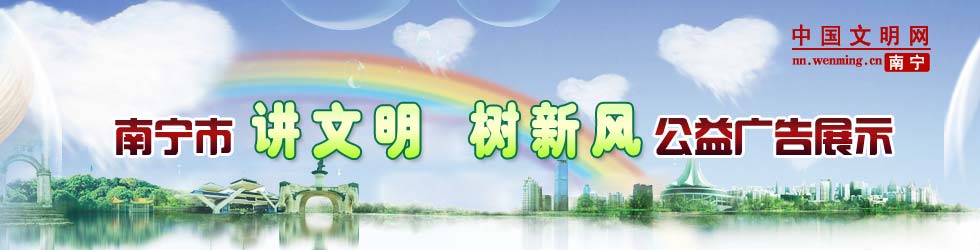 黨的十八大報告提出,倡導(dǎo)富強、民主、文明、和諧,自由、平等、公正、法治,愛國、敬業(yè)、誠信、友善,積極培育和踐行社會主義核心價值觀。為貫徹十八大精神,中國文明網(wǎng)特別開設(shè)“講文明樹新風(fēng)”公益廣告專欄,南寧文明網(wǎng)也專題展示各類公益廣告,如果您有好的公益廣告作品愿意和廣大網(wǎng)友分享,歡迎您發(fā)給我們